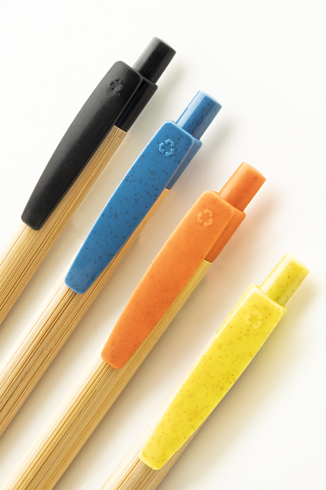Bambus-Kugelschreiber mit Clip und Spitze aus ökologischem Weizenstroh-Kunststoff, blauschreibend.