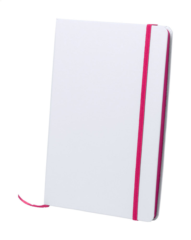 A5 Notizbuch, 100 Seiten (blanko), farbigem Gummiband und farblich abestimmten Blattrand.