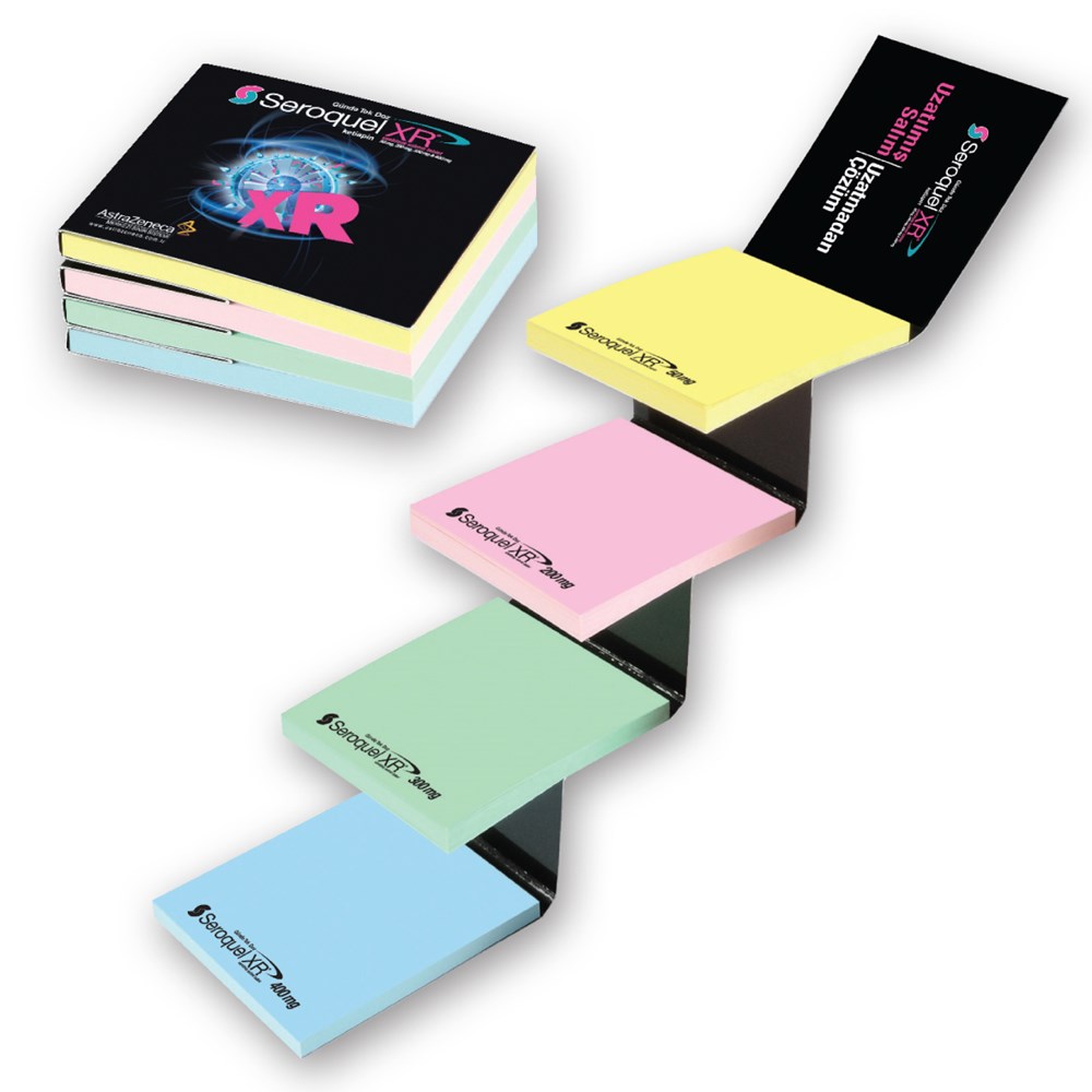 Kartoncover 7x7,5 cm - Druck 4/4c CMYK Haftnotizen - 70x75 mm - 4 Blöcke - à 50 Blatt - 1-2/0c Papier in weiß - 80 gr - *= Klebung Cover aufklappbar mit direktem Zugriff auf alle 4 Blöcke mit Papier-Banderole verschlossen