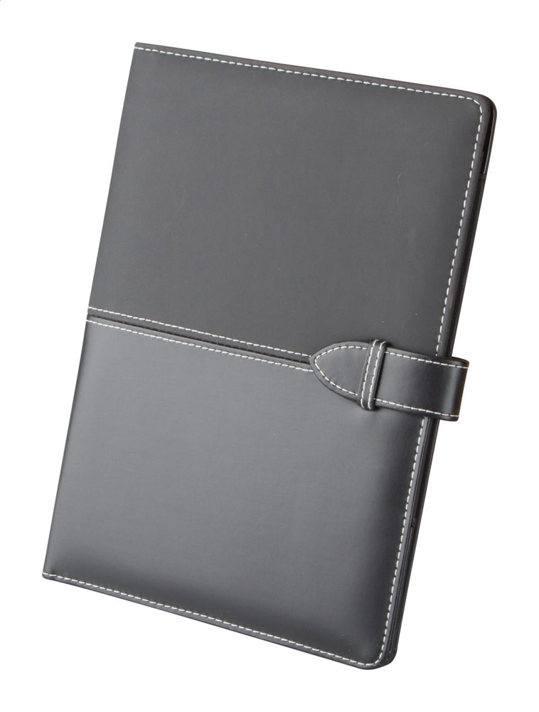 A5 Dokumentenmappe mit Notizblock mit 20 Seiten (liniert) und Stiftschlaufe. Material: Kunstleder.