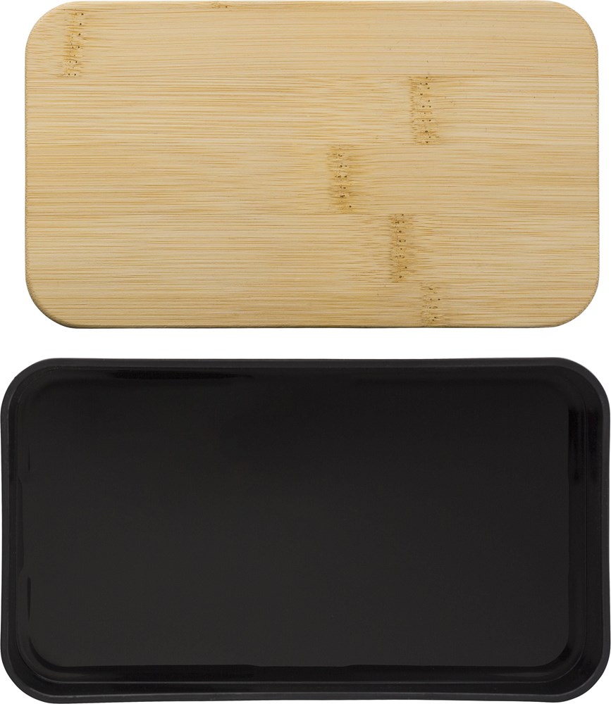 Doppellagige PP-Lunchbox mit mehreren Fächern (2 x 400 ml) und Bambusdeckel. Inklusive Trennwand und Plastikbesteck (Löffel, Gabel und Messer) und Gummiband.