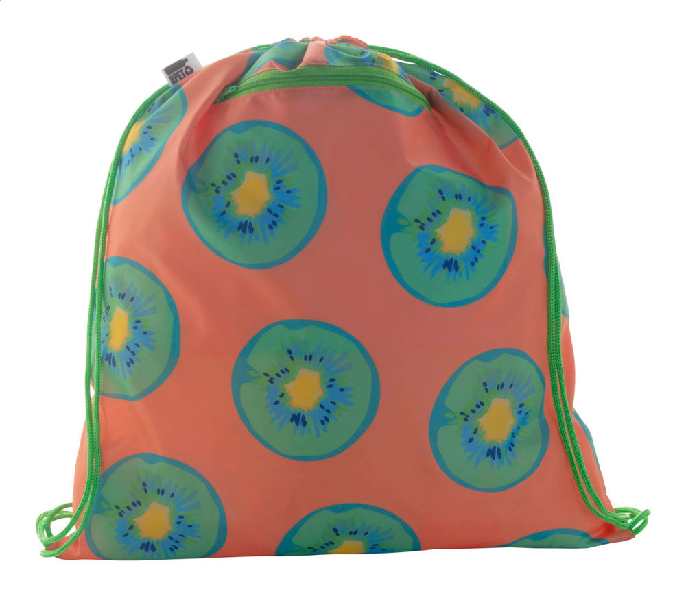 Individueller Turnbeutel mit Zugkordeln, mit Reißverschlusstasche vorne, Material: 190T RPET. Der Preis ist inkl. vollflächigem Sublimationsdruck. Mindestmenge: 25 Stk.
