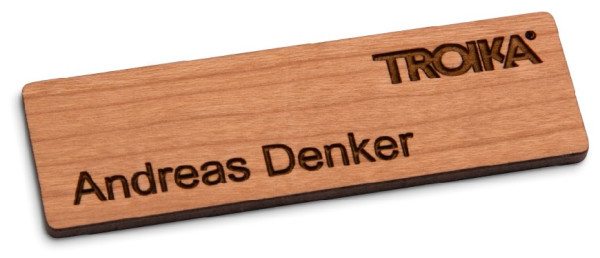 Holz-Namensschilder sind ideal, um einen „natürlichen“ Eindruck zu machen und einzigartig im Auftritt durch die individuelle Maserung des Naturmaterials. Das Namensschild Lignum | Comfort im dezenten Format 60x20 mm wird individuell mit Logo und Namen lasergraviert. Material: Kirsche, weitere Holzarten (Ahorn, Bambus, Birke, Walnuss) sind erhältlich. Das Holz-Namensschild ist mit einer kleiderschonenden Magnet-Befestigung ausgestattet und sofort einsatzbereit. Format- und Befestigungsalternativen sind verfügbar.