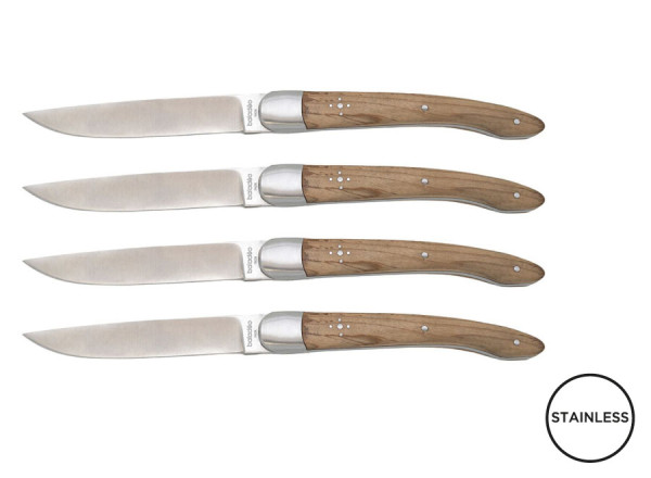 Steakmesser, welche gemäß strengen Spezifikationen hergestellt werden: Klinge aus rostfreiem 440er Edelstahl, welcher auch als Chirurgen-Stahl bezeichnet wird. Dieser bietet die perfekte Kombination aus Chrom (das vor Rost schützt) und Kohlenstoff (der für Schärfe sorgt). Martensitischer Stahl, der der Norm EN10088-2 2005 entspricht. Griffe aus feinem Olivenholz. Zwei Vollmaterial Heftbacken aus rostfreiem Edelstahl. Wird in einer Geschenkbox geliefert. Warnung: Diese Produkt ist nicht spülmaschinenfest.
