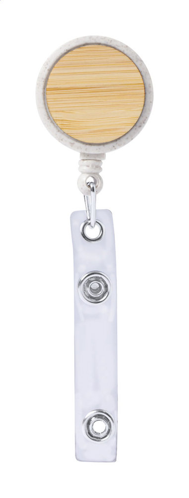 Ausweishalter aus ökologischem Weizenstrohkunststoff und Bambus mit Druckknopfverschluss, Teleskopschnur und Metallclip.
