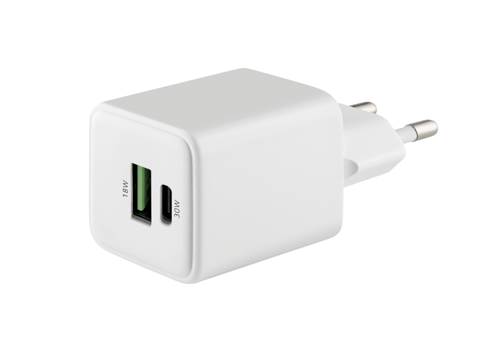 Next Generation High Speed Wall Charger - GAN (Galliumnitrid) Technologie mit 20% höherer Effektivität trotz schlanker Bauform, mit 2 Ports (USB-C: 30W, USB-A: 18W). Inkl. integriertem Kurzschluss-, Überstrom-, Überhitzungsschutz. Craft Paper Box.