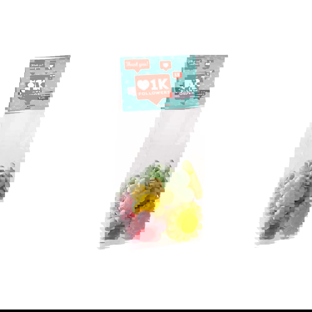 Transparenter Blockbeutel mit 4c-Euroskala bedruckter Topkarte, gefüllt mit ca. 100 Gramm Fruchtgummi Blumen