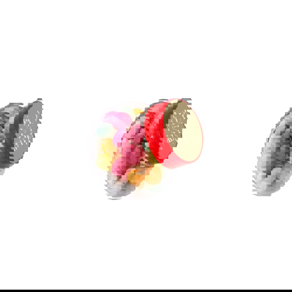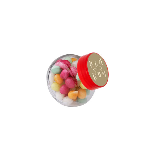 Mikro Glas 50 ml mit rotem Deckel gefüllt mit Farbige Zuckereier und einem 4c-Euroskala Aufkleber auf Deckel