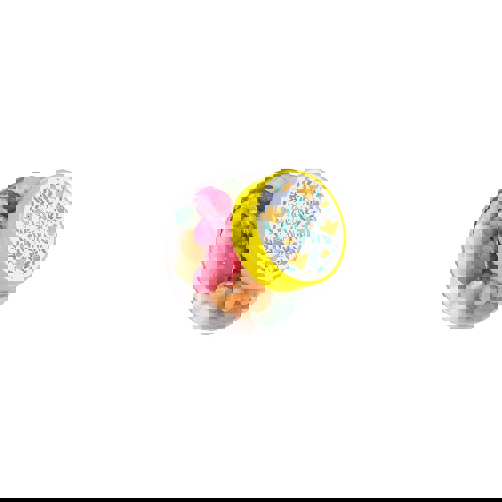 Mikro Glas 50 ml mit gelbem Deckel gefüllt mit Farbige Zuckereier und einem 4c-Euroskala Aufkleber auf Deckel