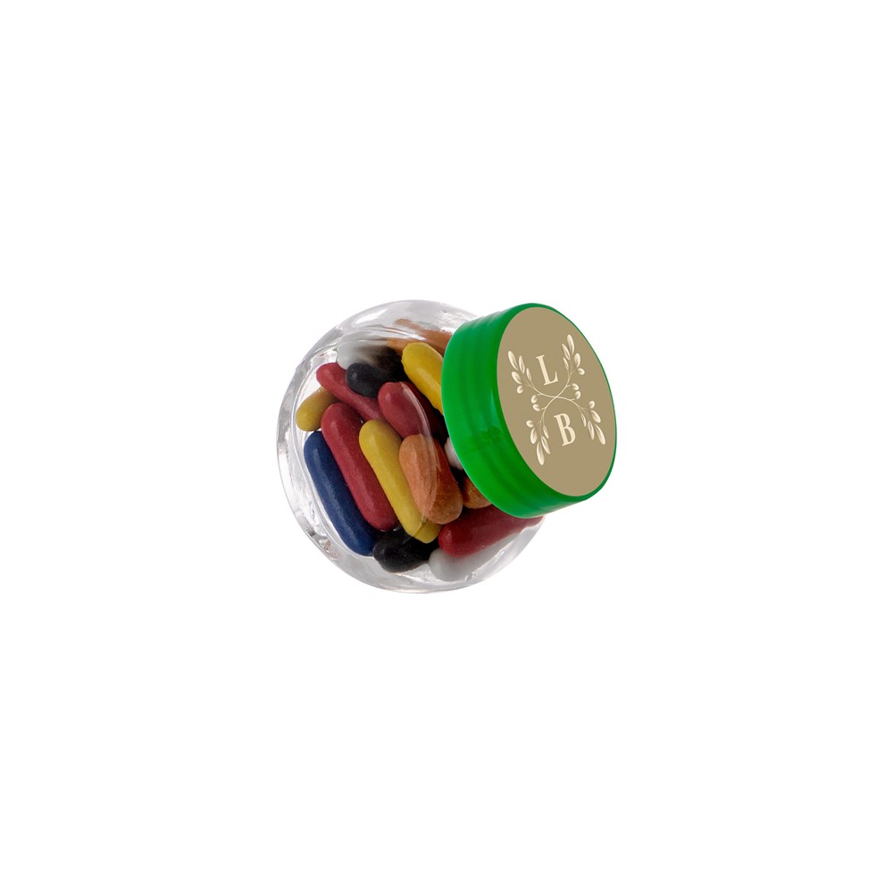 Mikro Glas 50 ml mit grünem Deckel gefüllt mit Lakritzstangen mix und einem 4c-Euroskala Aufkleber auf Deckel
