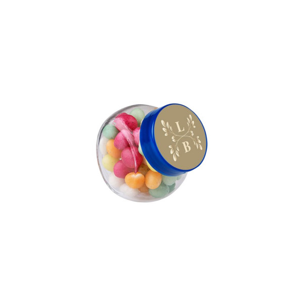 Mikro Glas 50 ml mit blauem Deckel gefüllt mit Farbige Zuckereier und einem 4c-Euroskala Aufkleber auf Deckel