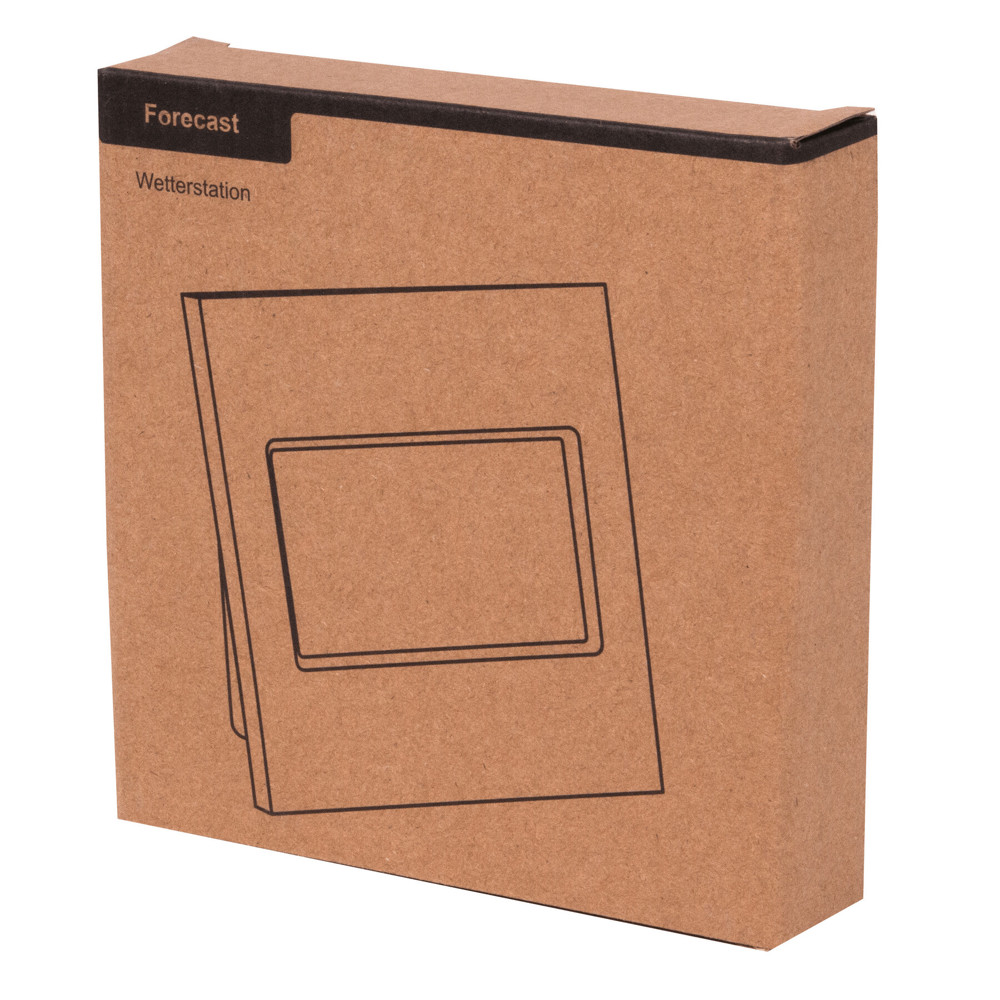 Wetterstation FORECAST: mit Bambusfront, Alarmfunktion, Datums- und Zeitanzeige, Hygrometer und Thermometer (°C und °F), ausklappbarer Aufsteller und Loch zur Wandmontage auf der Rückseite, batteriebetrieben (2x AAA Batterien nicht enthalten), in Box