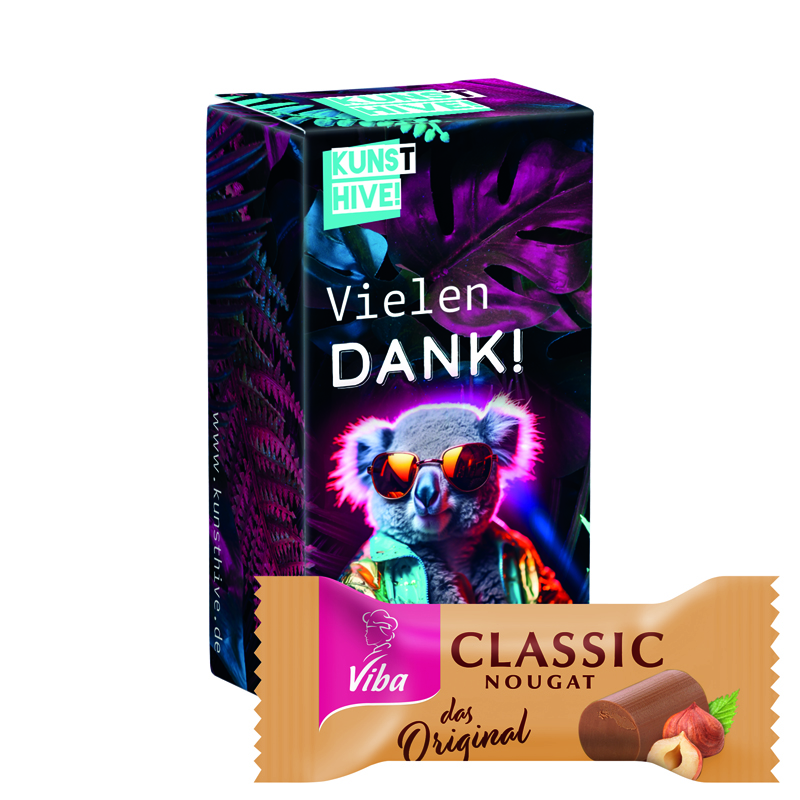Kleine Box aus weißem Karton, individuell bedruckt. Inhalt: 1 Viba Classic Nugat Mini, 10 g