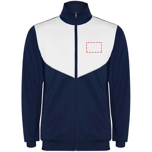 Trainingsanzug aus leichtem und elastischem Stoff. Jacke mit farblich abgesetzten Nähten im Brustbereich. Hoher Kragen mit Kontrastnähten. Zentraler Frontreißverschluss. Seitentaschen. 2x2-Rippenbündchen an Ärmeln und Bund. Hose mit elastischem Bund und Kordelzug. Seitliche Kontrasteinsätze mit Steppnaht. Beinsaum mit Reißverschluss.