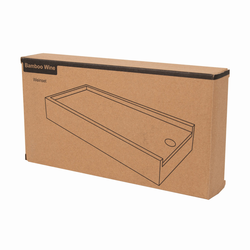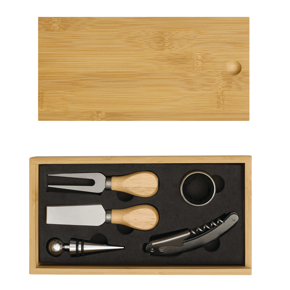 Wein- und Käseset BAMBOO WINE, in Bambus-Box, 6-teilig: bestehend aus Edelstahl-Tropfring, Metall-Flaschenverschluss, Edelstahl-Kellnermesser, Käsemesser und Gabel mit Holzgriff, Rückseite des Deckels als Schneidebrett nutzbar, in Box
