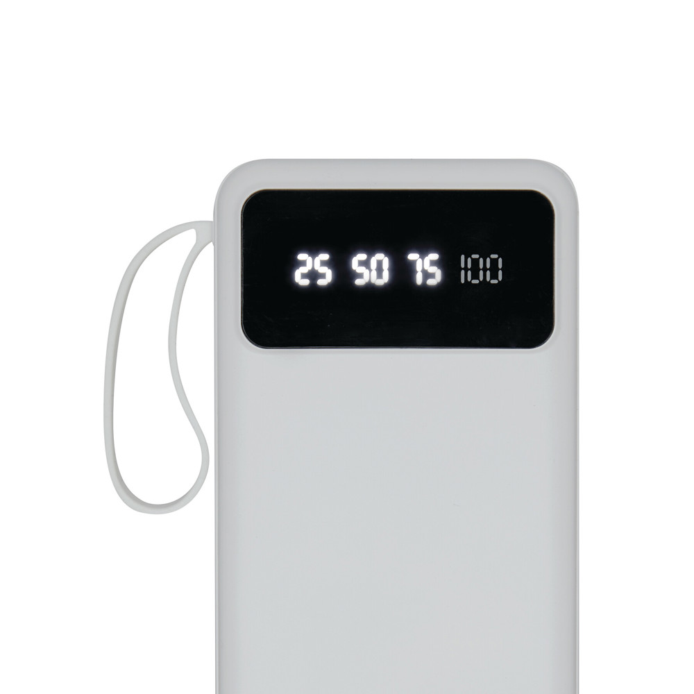 Powerbank MULTI CHARGE: geeignet für Smartphones und USB-betriebene Geräte, inkl. 4 integrierter Ladekabel auf der Rückseite (USB Typ C, Micro-USB, Lightning®, USB Typ A), mit Ladestandanzeige (25 / 50 / 75 / 100 %), Ein- und Ausschalter, je 1 USB Typ C und Micro-USB Eingang und 2 USB Typ A Ausgänge, Eingangsleistung: 5V/2A, Ausgangsleistung: 5V/2A (max.), Kapazität: 10.000 mAh, leistungsstarker Lithium-Akku, mit ausziehbarem Smartphone-Halter, in Box
