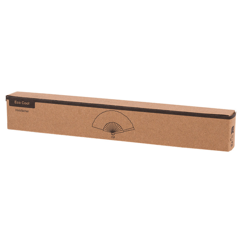 Faltbarer Fächer ECO COOL: stabiler Holzgriff und widerstandsfähige Holzstäbe mit Bespannung aus recyceltem Polyester, in Box