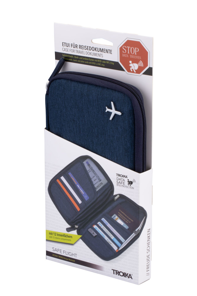 Etui für Reisedokumente, mit Ausleseschutzfolie (für RFID-Chips), Reißverschluss, 12 Innenfächer, Stiftschlaufe, 100% Polyester, Polyester, dunkelblau/orange