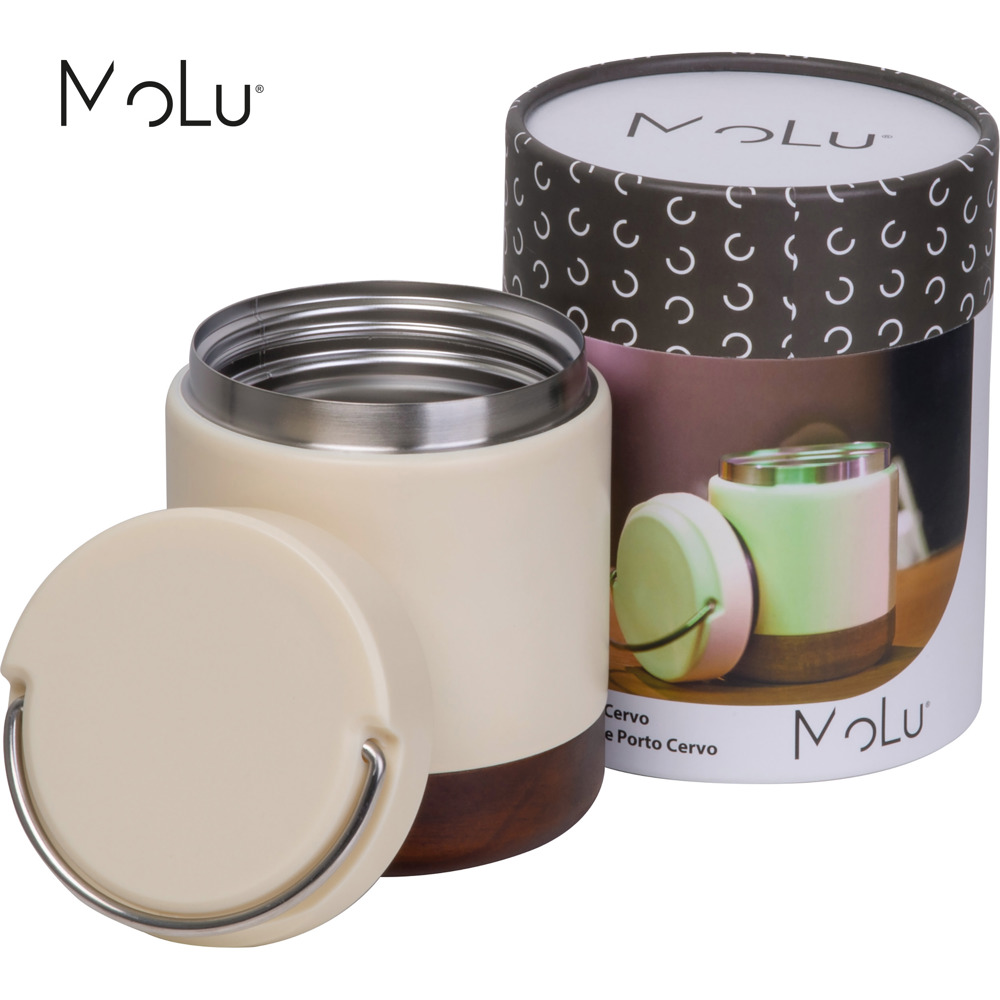 Stilvoller Foodcontainer aus recyceltem Edelstahl mit 400 ml Volumen. Auslaufsicherer Schraubdeckel mit Henkel, edler Akazienholzsockel. Direkt angebrachte Gravur für dauerhafte Markenpräsenz – ideal als Werbegeschenk oder praktisches Alltagsaccessoire.