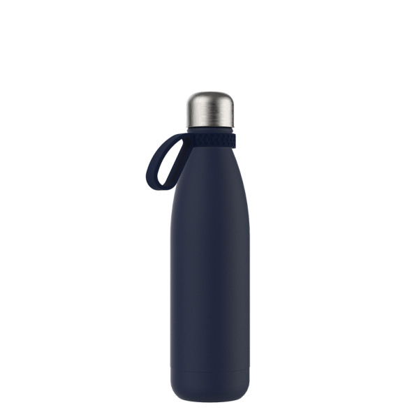 Für Heiß- oder Kaltgetränke, unsere doppelwandige Edelstahlflasche überzeugt durch trendiges und funktionales Design. Durch die Doppelwandigkeit mit Vakuum bleiben ihre Getränke lange kalt bzw. heiß. Die Trinkflasche kann mit navy-blauem, edlen mattschwarzem, weißem Powder Coating oder natürlich silberglänzend bestellt werden. 500 ml Fassungsvermögen stehen zur Verfügung. Setzen Sie ihr Logo stilvoll in Szene auf der Trend Trinkflasche schlechthin.
