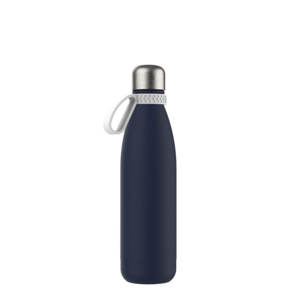 Für Heiß- oder Kaltgetränke, unsere doppelwandige Edelstahlflasche überzeugt durch trendiges und funktionales Design. Durch die Doppelwandigkeit mit Vakuum bleiben ihre Getränke lange kalt bzw. heiß. Die Trinkflasche kann mit navy-blauem, edlen mattschwarzem, weißem Powder Coating oder natürlich silberglänzend bestellt werden. 500 ml Fassungsvermögen stehen zur Verfügung. Setzen Sie ihr Logo stilvoll in Szene auf der Trend Trinkflasche schlechthin.