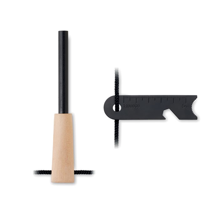 Feuerstarter-Set aus Kiefernholz und Edelstahl. Inkl. Feuerstarter, Mehrzweck-Schaber, Kapselheber, Lineal und Sechskantschlüssel.