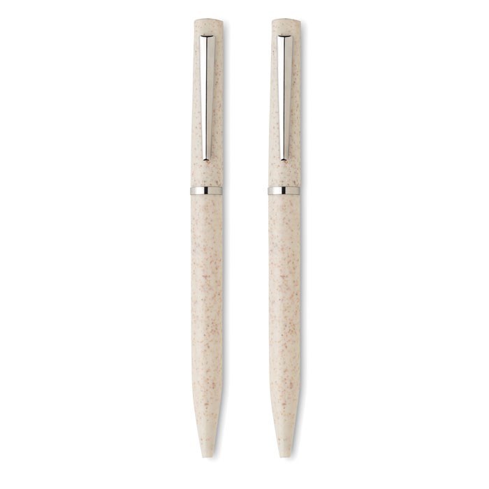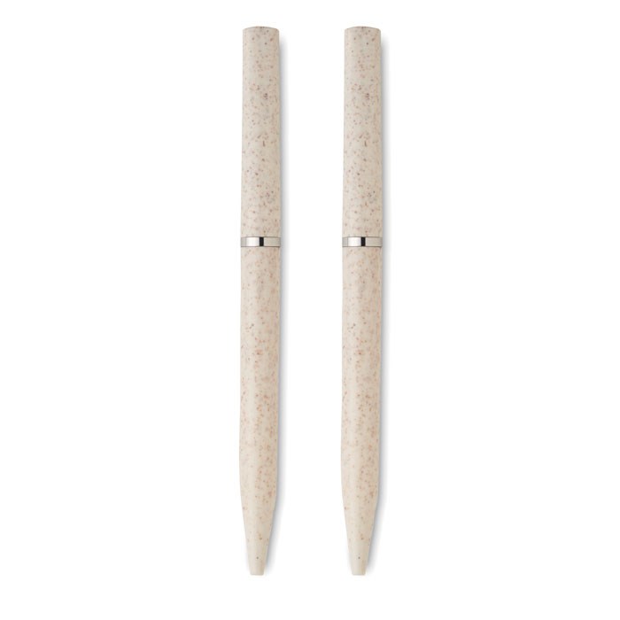 Schreibgeräte-Set mit 2 Drehkugelschreibern (1x blaue Tinte, 1x Graphitmiene). Gehäuse aus Weizenstroh/ABS. Lieferung in Schachtel aus recyceltem Papier. FSC®-certified | FSC MIX, P5.1, FSC-C213206