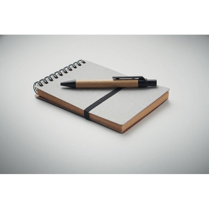 Notizbuch mit Cover aus Recyclingpapier und PU (70% Recyclingpapier, 30% PU). Spiralbindung. 70 Blatt (140 Seiten) liniertes Recyclingpapier. Elastisches Verschlussband und Stiftschlaufe. Inkl. Druckkugelschreiber aus Recyclingpapier/ABS. Blaue Tinte. FSC®-certified | FSC MIX CREDIT, P7.1, FSC-C213206