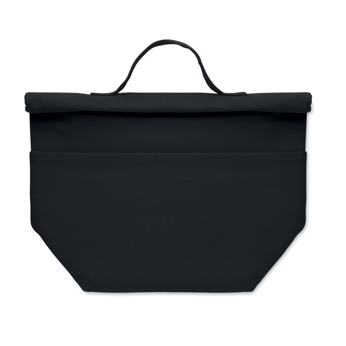 Kühltasche aus aus recyceltem Polycotton (70% recycelte Baumwolle, 30% recycelter Polyester) mit Rolltop-Klettverschluss. Isolierung: 3mm PE- Schaum mit 12C PEVA.