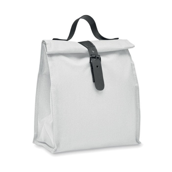 Lunch-Kühltasche aus 600D RPET-Polyester mit Rolltop. Tragegriff und Verschluss aus PU. Isolierung: 3mm PE-Schaum mit PEVA.