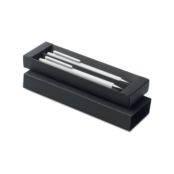 Schreibset aus recyceltem Aluminium. Bestehend aus 2 Kugelschreibern (1x blaue Tinte, 1x Graphitmiene). Präsentiert in einer Schachtel aus recyceltem Papier.