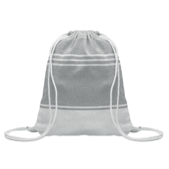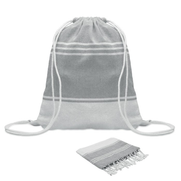 Strandtuch/Hammamtuch im passenden Beutel mit Kordelzug. 70% recycelte Baumwolle und 30% recycelter Polyester 180 g/m². Maße Tuch: 90x160 cm.