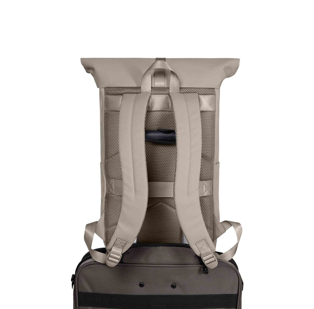 modischer Rolltop-Rucksack; Reißverschluss-Hauptfach mit verstellbarem Verschlusssystem; Schlaufenband auf dem Deckel; wertige Metallaccessoires; gepolstertes Notebookfach; Reißverschluss-Vortasche; zwei seitliche Einsteckfächer; gepolsterter Boden; gepolstertes Tragesystem; rückseitige Befestigungsschlaufe für Trolley-Gestänge; Handgriff