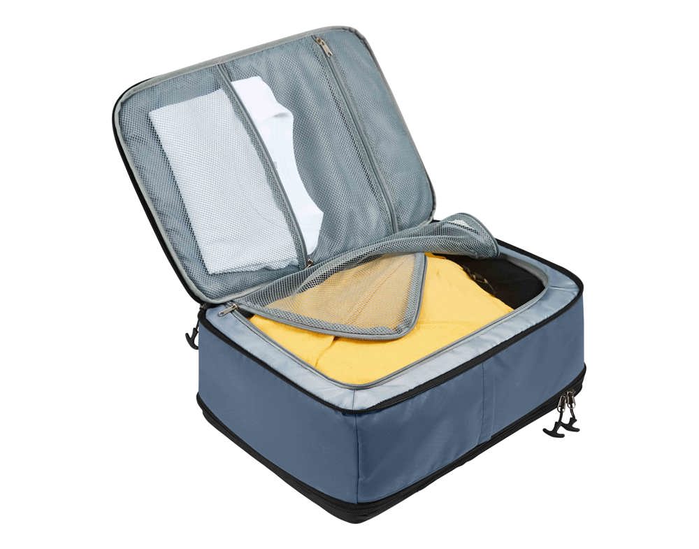geräumiger Business-Rucksack; große Reißverschluss-Vortasche und Schlaufenband; seitliches Einsteckfach; zwei Handgriffe; großes, gepolstertes Gepäck-Hauptfach mit Netzdeckel, 2-Wege-Reißverschluss sowie seitlichem Netz-Einsteckfach und Schlüsselband; zwei Reißverschluss-Netztaschen im Hauptfachdeckel; Volumenerweiterung Hauptfach; separat zugängliches 2-Wege-Reißverschlussfach für Arbeitsausstattung: Tablet- und Notebookfach, beide mit Veloursfutter und elastische Fixierschlaufe; Netzfach; Einsteckfach geeignet für A4-Unterlagen; Stiftschlaufe; gut gepolstertes Rückentragesystem mit verstellbarem Brustgurt; rückseitig Befestigungsschlaufe für Trolley-Gestänge