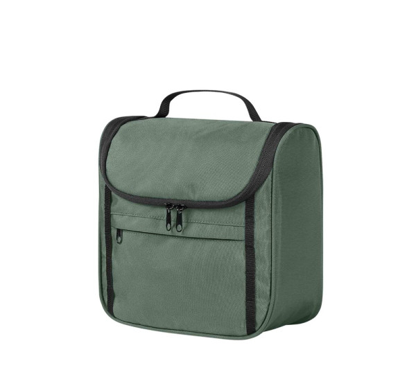 attraktive Kulturtasche zum Hängen oder Stellen; recycelter Oberstoff; Reißverschlussvortasche; Schlaufenband auf der Front; dreiseitig umlaufender 2-Wege-Reißverschluss; Reißverschluss-Fach im Deckel; vier Netz-Einsteckfächer innen; Handgriff