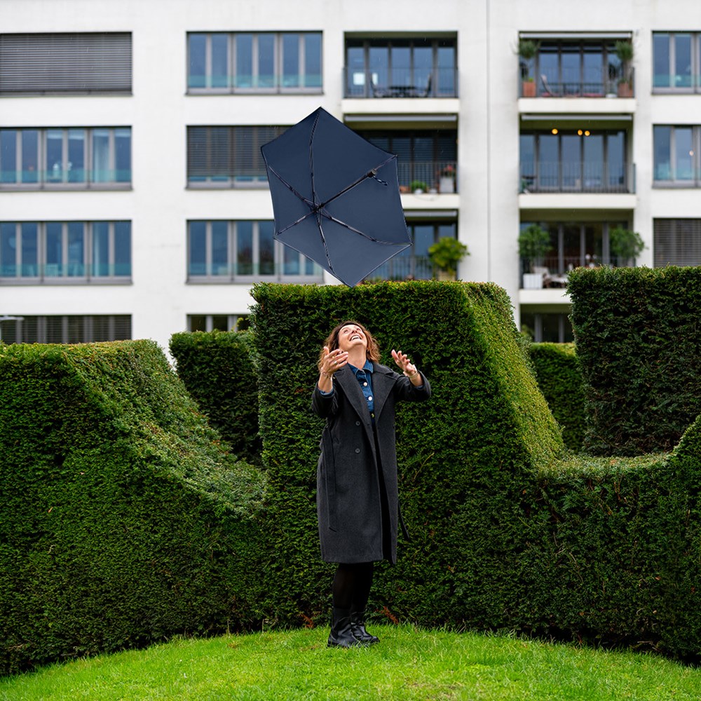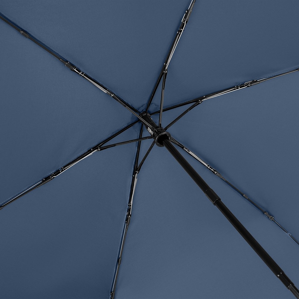 Filigraner Doppelautomatik-Taschenschirm in superleichter Ausführung Komfortable Automatik-Funktion zum schnellen Öffnen und Schließen, hochwertiges Windproof-PLUS-System für eine maximale Gestell-Flexibilität bei stärkeren Windböen, schwarzer Aluminiumstock, wassersparend gefärbtes Polyester-Pongee waterSAVE® Bezugsmaterial aus recycelten Kunststoffen, mit waterSAVE®-Label auf dem Schließband, matt-schwarzer Kunststoff-Softfeel-Griff mit Auslösetaste und Werbeanbringungsmöglichkeit, handtaschentauglich durch superleichtes Gewicht und kompakte Größe