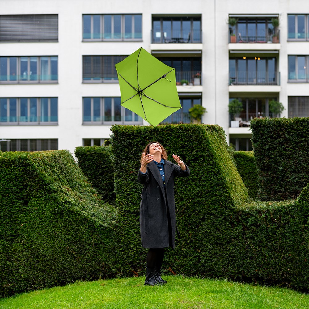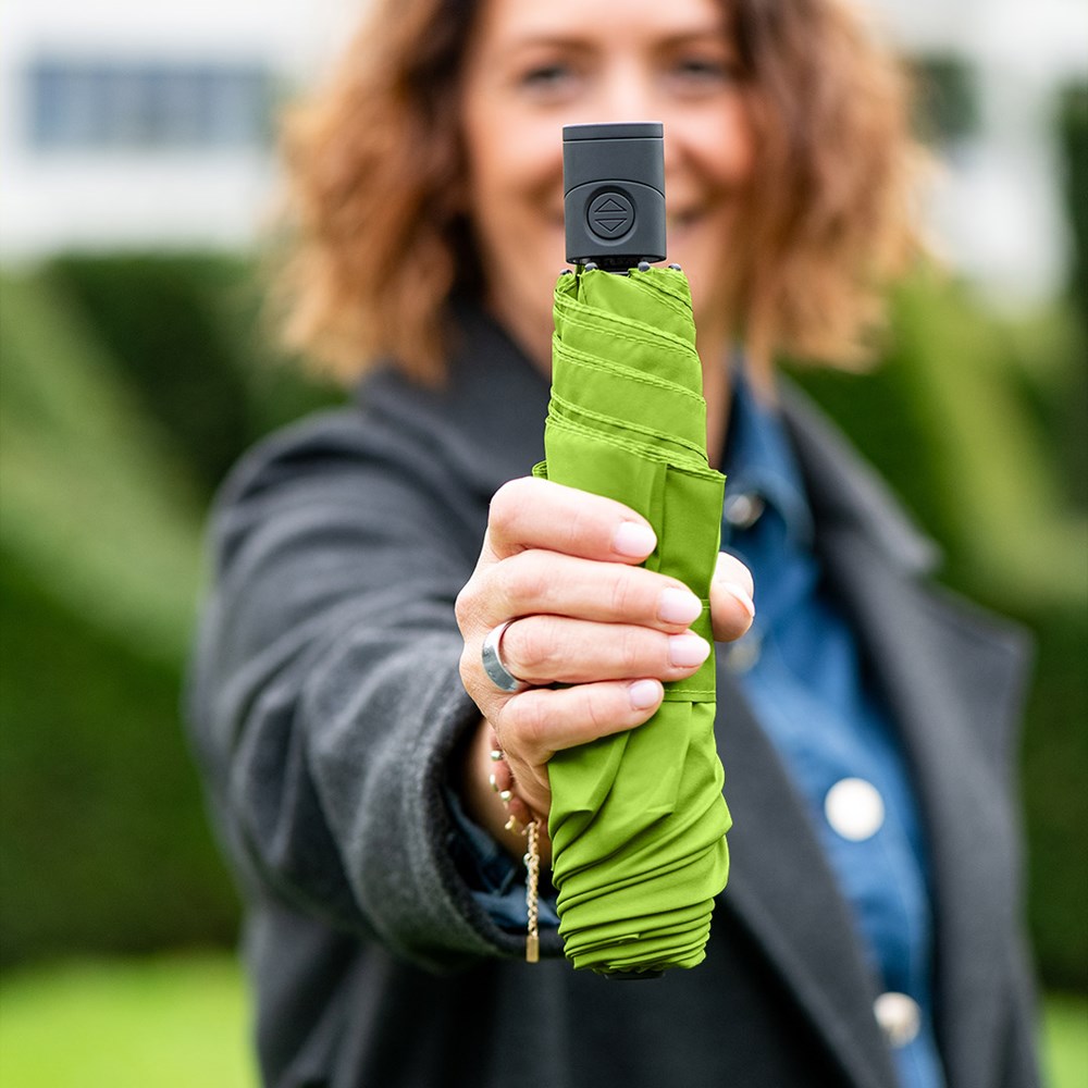 Filigraner Doppelautomatik-Taschenschirm in superleichter Ausführung Komfortable Automatik-Funktion zum schnellen Öffnen und Schließen, hochwertiges Windproof-PLUS-System für eine maximale Gestell-Flexibilität bei stärkeren Windböen, schwarzer Aluminiumstock, wassersparend gefärbtes Polyester-Pongee waterSAVE® Bezugsmaterial aus recycelten Kunststoffen, mit waterSAVE®-Label auf dem Schließband, matt-schwarzer Kunststoff-Softfeel-Griff mit Auslösetaste und Werbeanbringungsmöglichkeit, handtaschentauglich durch superleichtes Gewicht und kompakte Größe