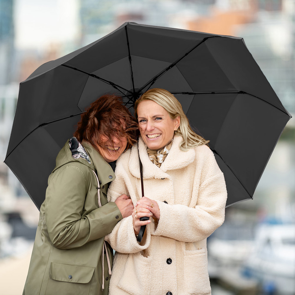 Äußerst stabiler Doppelautomatik-Gäste-Taschenschirm für zwei Personen Komfortable Doppelautomatik-Funktion zum schnellen Öffnen und Schließen, hochwertiges Windproof-PLUS-System für eine maximale Gestell-Flexibilität bei stärkeren Windböen, flexible Fiberglasschienen, überlappender Ventilationsbezug zur Regulierung von Überdruck durch stärkere Windböen, wassersparend gefärbtes Polyester-Pongee waterSAVE® Bezugsmaterial aus recycelten Kunststoffen und mit modischer Reflexpaspel in Silber, mit waterSAVE®-Label auf dem Schließband, Griff aus recyceltem ABS (rABS) mit integrierter Auslösetaste und Werbeanbringungsmöglichkeit, komfortables Futteral mit hochwertigem Zipper, gastfreundlicher großer Durchmesser