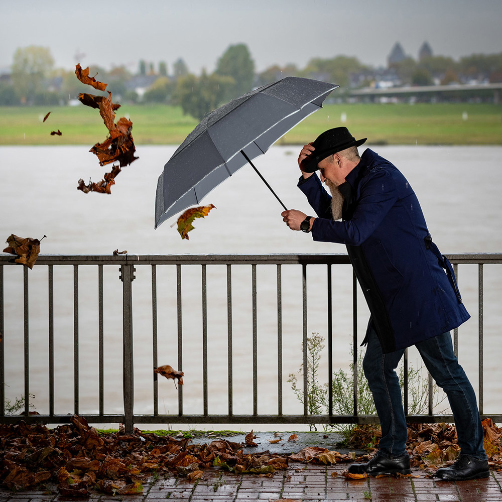 Äußerst stabiler Doppelautomatik-Taschenschirm in Übergröße Komfortable Doppelautomatik-Funktion zum schnellen Öffnen und Schließen, hochwertiges Windproof-PLUS-System für eine maximale Gestell-Flexibilität bei stärkeren Windböen, flexible Fiberglasschienen, überlappender Ventilationsbezug zur Regulierung von Überdruck durch stärkere Windböen, wassersparend gefärbtes Polyester-Pongee waterSAVE® Bezugsmaterial aus recycelten Kunststoffen und mit modischer Reflexpaspel in Silber, mit waterSAVE®-Label auf dem Schließband, Griff aus recyceltem ABS (rABS) mit integrierter Auslösetaste und Werbeanbringungsmöglichkeit, komfortables Futteral mit hochwertigem Zipper