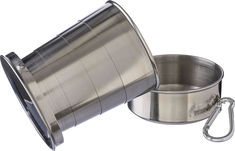 Faltbarer Becher aus Edelstahl (220 ml) mit einem Metallkarabiner. Einzeln verpackt in einer braunen Pappschachtel.