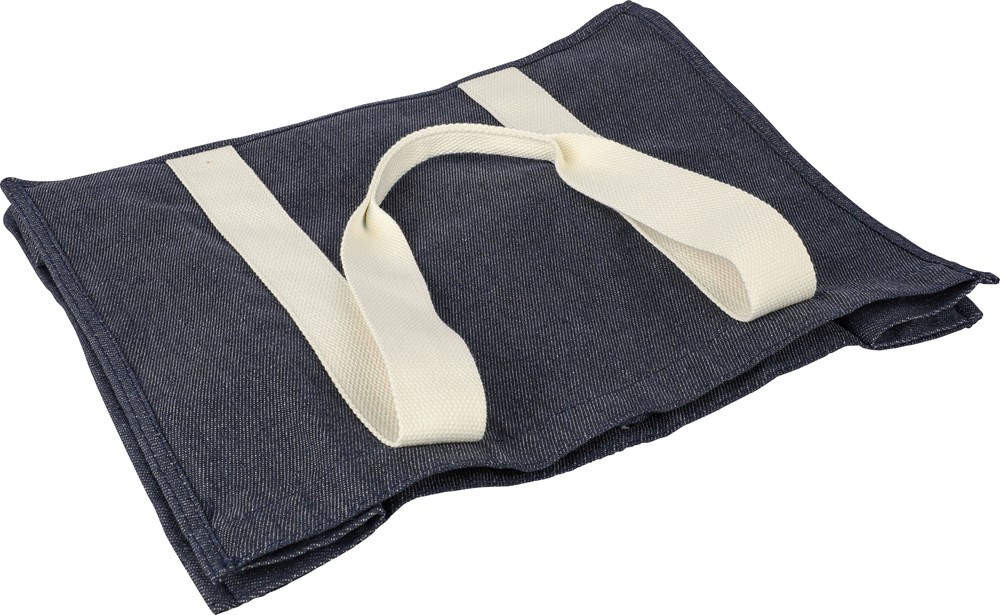 Einkaufstasche aus Denim (280 g/m2) mit 15 Zentimeter langen Zwickeln und langen Griffen aus Canvas (280 g/m2). Das Denim-Material besteht aus 65% Polyester und 35% Baumwolle. Mit einem Druckknopf zum Schließen der Tasche. Die Farbechtheit von Denim beträgt bis zu 2-3 Stufen.