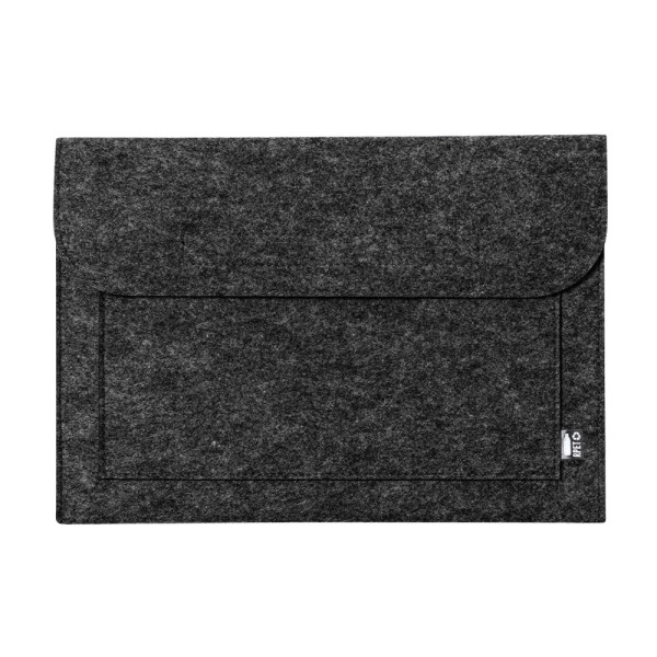 Laptophülle der Liene "Natur" aus widerstandsfähigem recyceltem RPET-Filz, das Ergebnis der Kombination des Recyclingprozesses von Kunststoffmaterialien mit der alten Technik der Filzherstellung, was zu einem Öko-Trend-Material führt, das nicht nur recycelten Ursprungs ist, sondern auch zu recycelbar. Überschlag mit Klettverschlüssen und Fronttasche, mit markantem RPET auf dem Außenetikett.