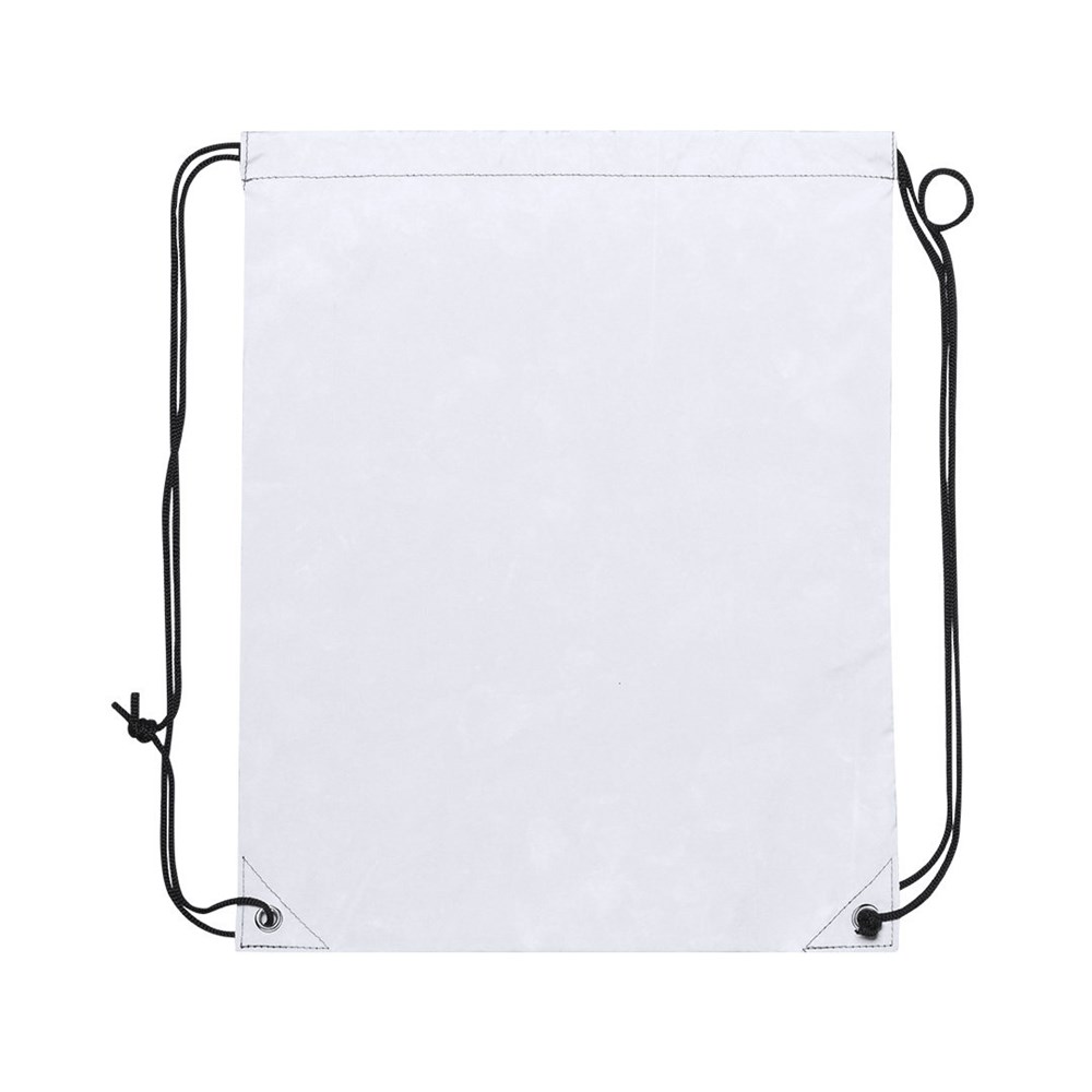 Weicher 210T Polyester-Seilrucksack. Hergestellt aus Gewebe mit hoher Lichtreflexionsfähigkeit dank Millionen reflektierender Pigmente und basierend auf dem Prinzip der Retroreflexion des Lichts, einer Eigenschaft der Nachtsichtbarkeit, die aus der Brechung des Lichts in Richtung der Quelle besteht gleich. Mit schwarzen selbstschließenden Kordeln und Metallringen. Widerstand bis zu 7 kg Gewicht und beständig gegen Wasser.