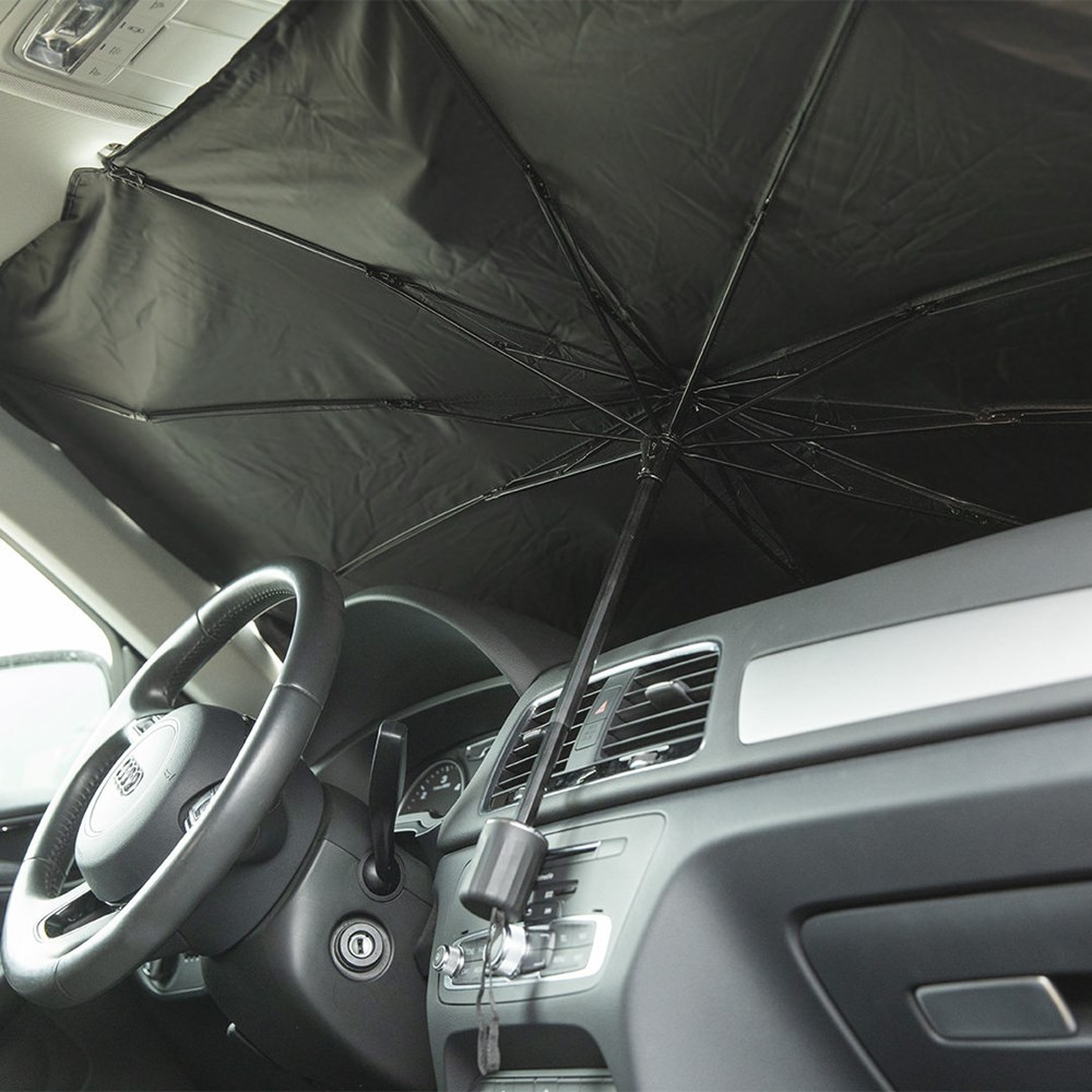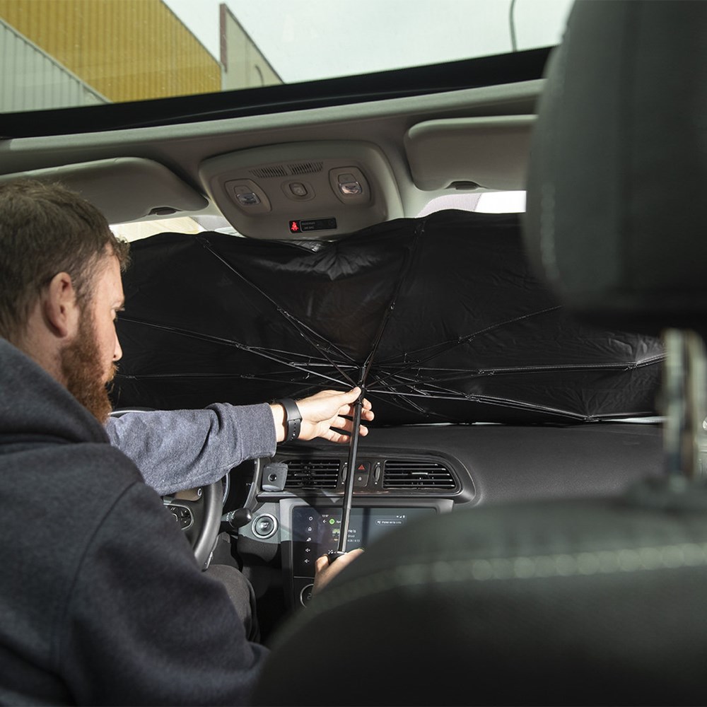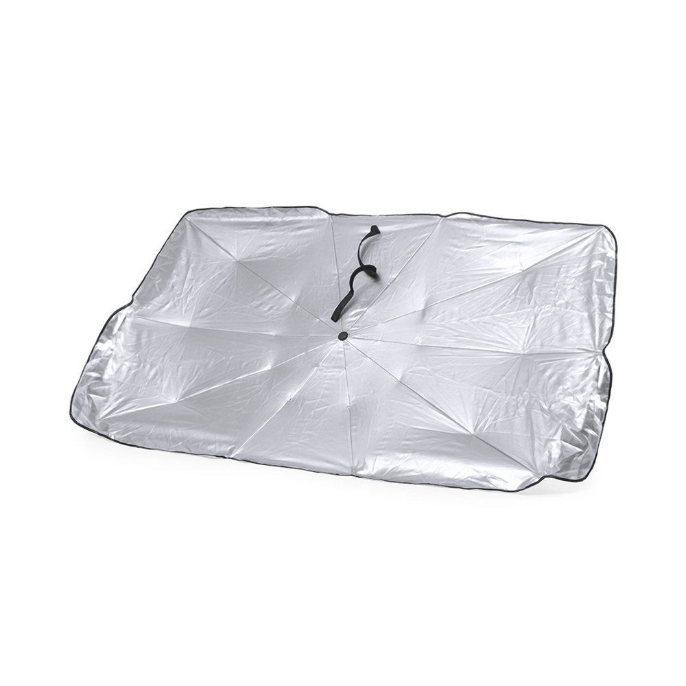 Faltbare Auto-Sonnenschutz. Größe 140x78cm. Mit manuellem Öffnungsmechanismus und Polyesterhülle im Lieferumfang.