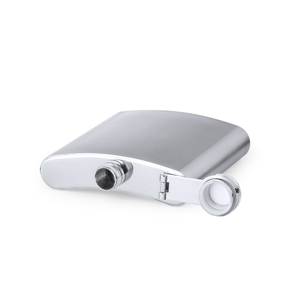 175-ml-Flasche mit Edelstahlgehäuse und Sicherheitsschraubverschluss. Ergonomisch geformt, um bequem in die Tasche zu passen. Präsentiert in einer individuellen Ökodesign-Box aus Kraftkarton.