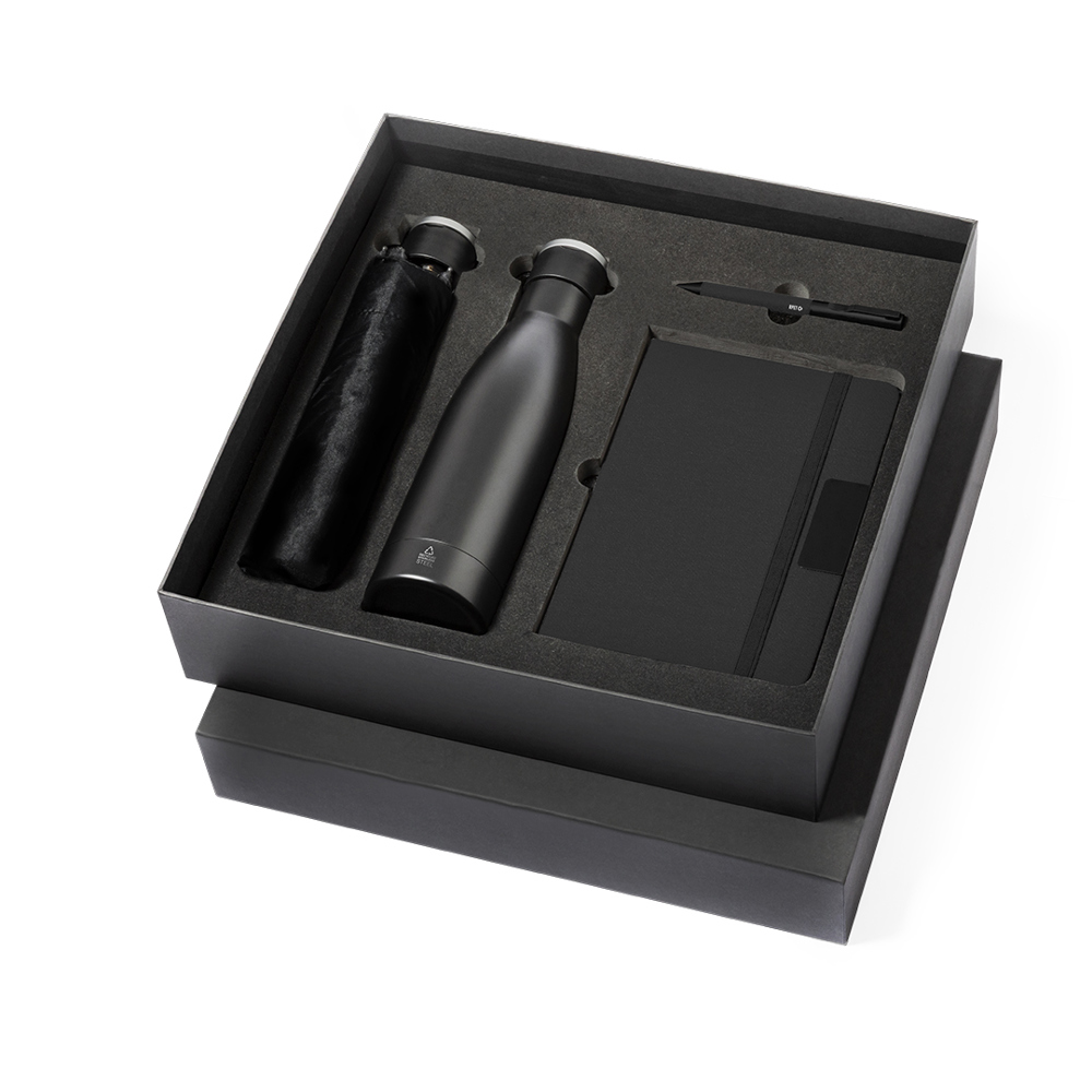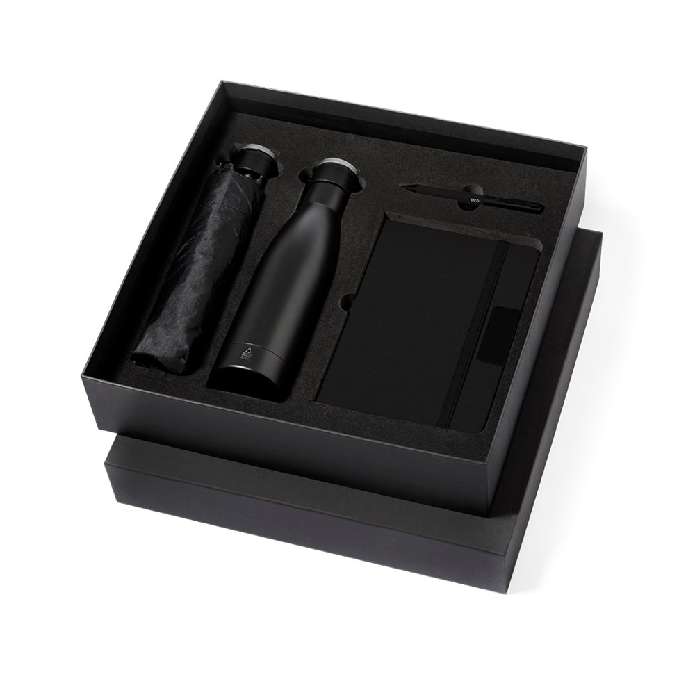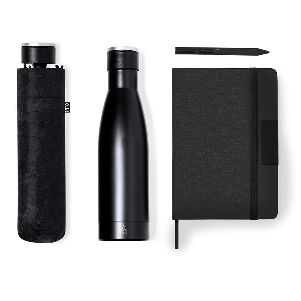 Elegantes Premium-Set, bestehend aus:Doppellagige Thermoskanne aus recyceltem Edelstahl mit mattschwarzem Finish und 500 ml Fassungsvermögen, mit stabilem, matt-silberfarbenem Metallgriff. Mit Edelstahl-PlaketteRPET-Notizblock in elegantem Schwarz, mit speziellen Metalldetails für die Laserbeschriftung. Mit elastischem Verschluss und Lesezeichen aus Stoff. Innen mit 80 Blatt einfarbigem Layout. Mit RPET-LogoFaltbarer Regenschirm in Schwarz mit einem Durchmesser von 98 cm. Hergestellt aus 190T RPET-Pongee-Material. Manuelle Öffnung, mit Anti-Wind-System und Fiberglas-Rippen. Mit Tragetasche und passenden Bändern. Mit unverwechselbarem RPET-Etikett.Kugelschreiber aus RPET mit mattschwarzem Finish, Drehmechanismus und blauer Tinte. Präsentiert in einem individuellen, mattschwarzen Etui mit einer Innenstanzung für jedes Element des Sets.Das RPET-Material wird aus recyceltem Kunststoff hergestellt, wodurch die Wiederverwendung von Kunststoffabfällen gefördert und ein Beitrag zur Nachhaltigkeit unseres Planeten geleistet wird.