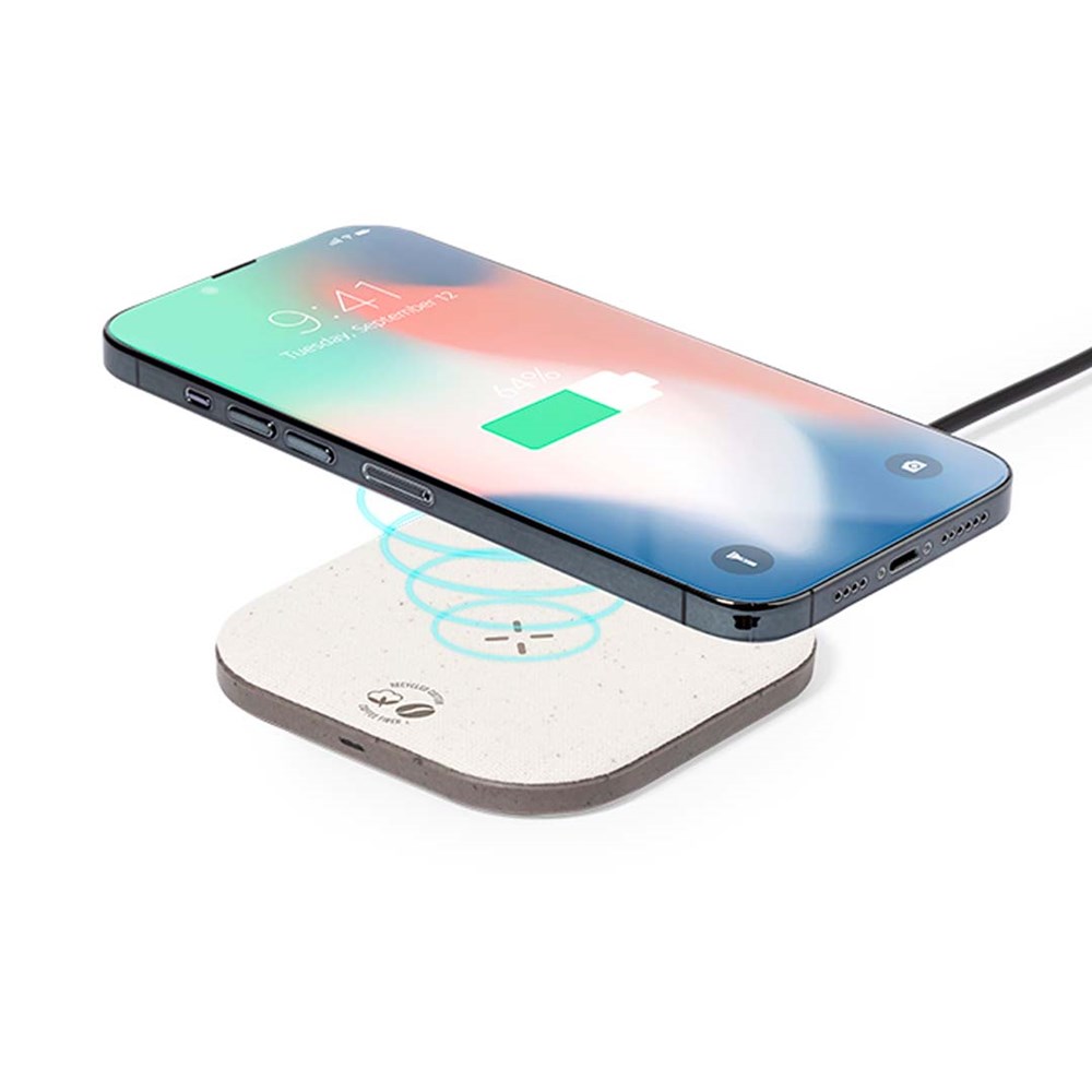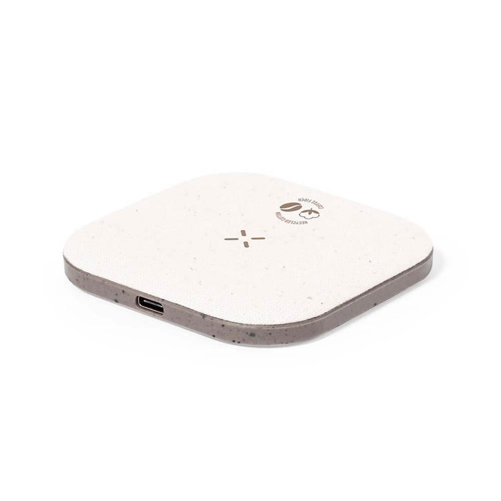 Kabelloses Ladegerät auKabelloses Ladegerät aus Kaffeefasern und recycelter Baumwolle. Rutschfeste Basis und kompatibel mit Geräten, die mit Qi-Ladetechnologie ausgestattet sind. Ladekapazität von 15 W, mit schwarzem Typ-C-Kabel im Lieferumfang. Mit Aufklebern aus Kaffeefasern und recycelter Baumwolle. Präsentiert in einer attraktiven Kraft-Design-Box, mit Bedienungsanleitung in Englisch und Spanisch.Kaffeefasern sind eine Kreislauflösung, die aus der Verwendung von Abfällen der Kaffeeproduktion gewonnen wird. Eine nachhaltige Alternative, die die Reduzierung der Verwendung von Kunststoffen begünstigt, Energie im Herstellungsprozess spart und zum Umweltschutz beiträgt.Es gibt eine GRS-Zertifizierung (Global Recycled Standard), die die recycelte Herkunft des für die Herstellung des Produkts verwendeten Materials garantiert.s Kaffeefasern und recycelter Baumwolle. Rutschfeste Basis und kompatibel mit Geräten, die mit Qi-Ladetechnologie ausgestattet sind. Ladekapazität von 15 W, mit schwarzem Typ-C-Kabel im Lieferumfang. Mit Aufklebern aus Kaffeefasern und recycelter Baumwolle. Präsentiert in einer attraktiven Kraft-Design-Box, mit Bedienungsanleitung in Englisch und Spanisch.
