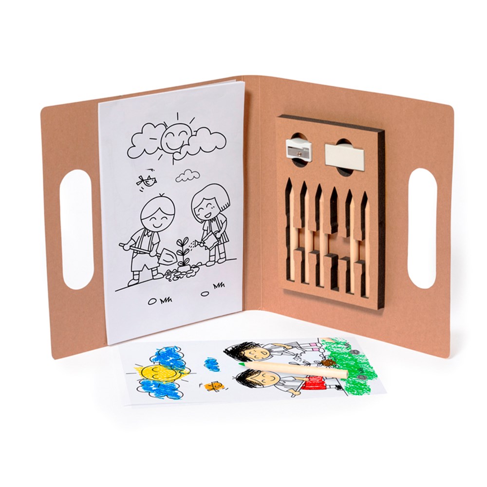 Malset aus recyceltem Karton. Inklusive einem verspielten Satz Zeichnungen und Buntstiften in einer praktischen Mappe mit Griffen. Inhalt: 20-Blatt-Block mit Naturzeichnungen zum Ausmalen. Box mit 6 Holzstiften in verschiedenen Farben. Anspitzer. Radiergummi.