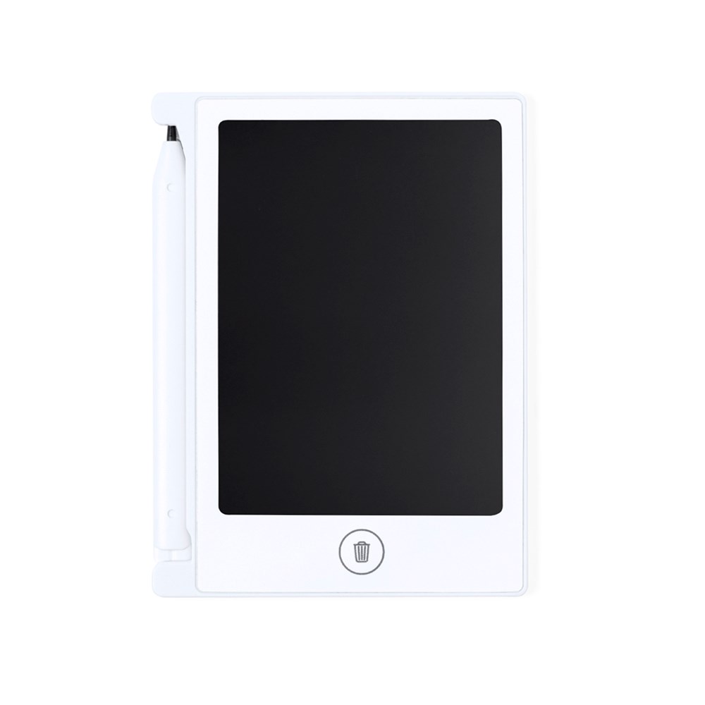 LCD-Schreibtablett aus widerstandsfähigem Material, mit Magnetbefestigung und Stifthalter. 4,5-Zoll-LCD-Bildschirm, einschließlich Stift, Löschtaste und Löschsperre. Knopfbatterie im Lieferumfang enthalten und in einer Box im Kraftdesign verpackt.
