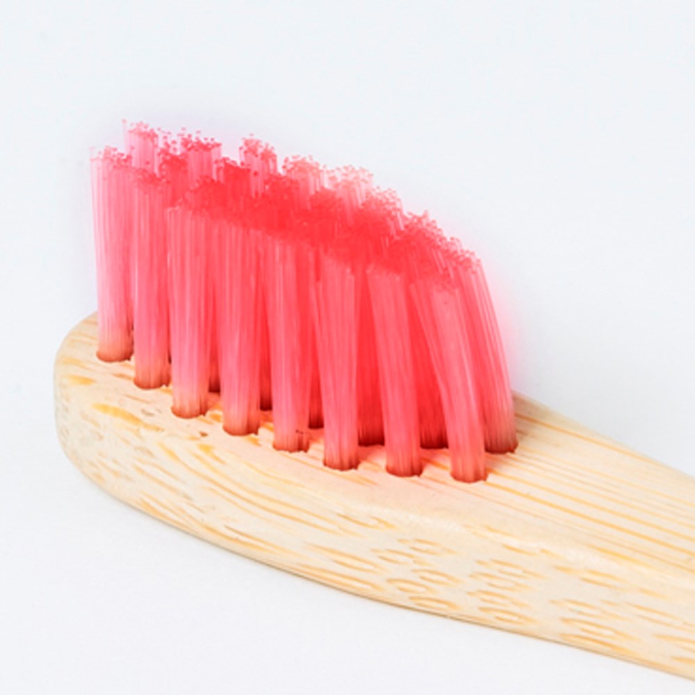 Zahnbürste aus Bambus. Für Kinder konzipiert, mit bunten Borsten und Spitzen. Einzeln in einer Kraftbox präsentiert.